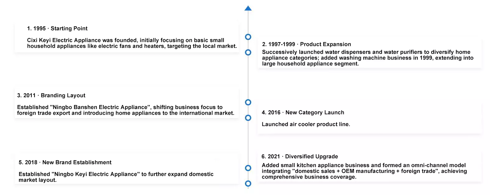 Kanthi dekade pembangunan anteng, Ningbo Keyi Electric Appliance Co., Ltd. wis musna liwat lelampahan ing ngisor iki: Ing taun 1995, Cixi Keyi Electric Appliance didegaké, pisanan ngarahke ing pasar lokal lan utamané melu Perkakas kluwarga cilik kayata penggemar listrik lan pemanas.